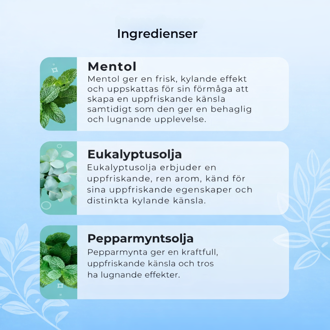 Eteriska oljor som mynta och eukalyptus bidrar till en uppfriskande sensorisk effekt som kan upplevas som ökad klarhet och fokus.