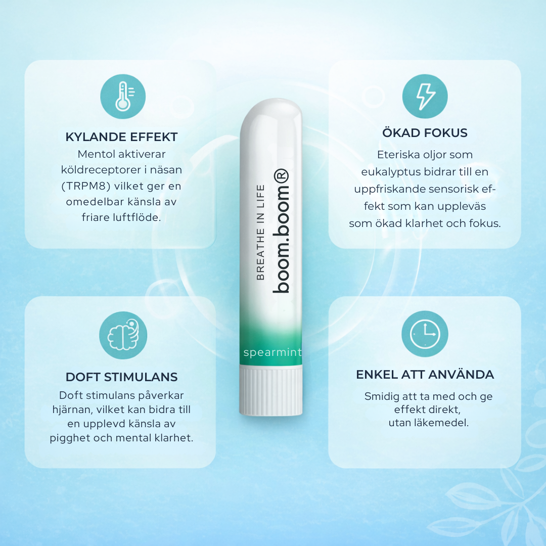 Med mentol och eteriska oljor får du klarare andning, bättre fokus och ny energi när som helst, var som helst.